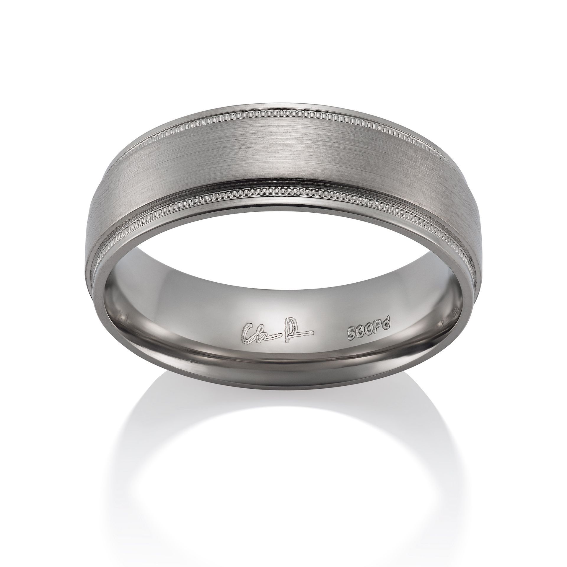 Palladium (Pd) is a member of the platinum group. Palladium is lightweight, durable, hypoallergenic, and resists tarnishing. Palladium is considered a white metal, although it appears light gray in color compared to sterling silver or 14K white gold. Chris Ploof Designs uses two types of Palladium: 950 Palladium (950 Pd) and Palladium 500 (Pd500). The 950 palladium alloy is a mixture of pure palladium (95%) and another platinum group metal, ruthenium (5%). Palladium 500 is an alloy comprised of 50% Palladium with the remainder being Silver and Copper. Palladium can be used as a replacement for platinum or white gold. Compared to platinum, palladium is lighter in weight, harder, and much less expensive. Palladium, like platinum, is much more durable than white gold.