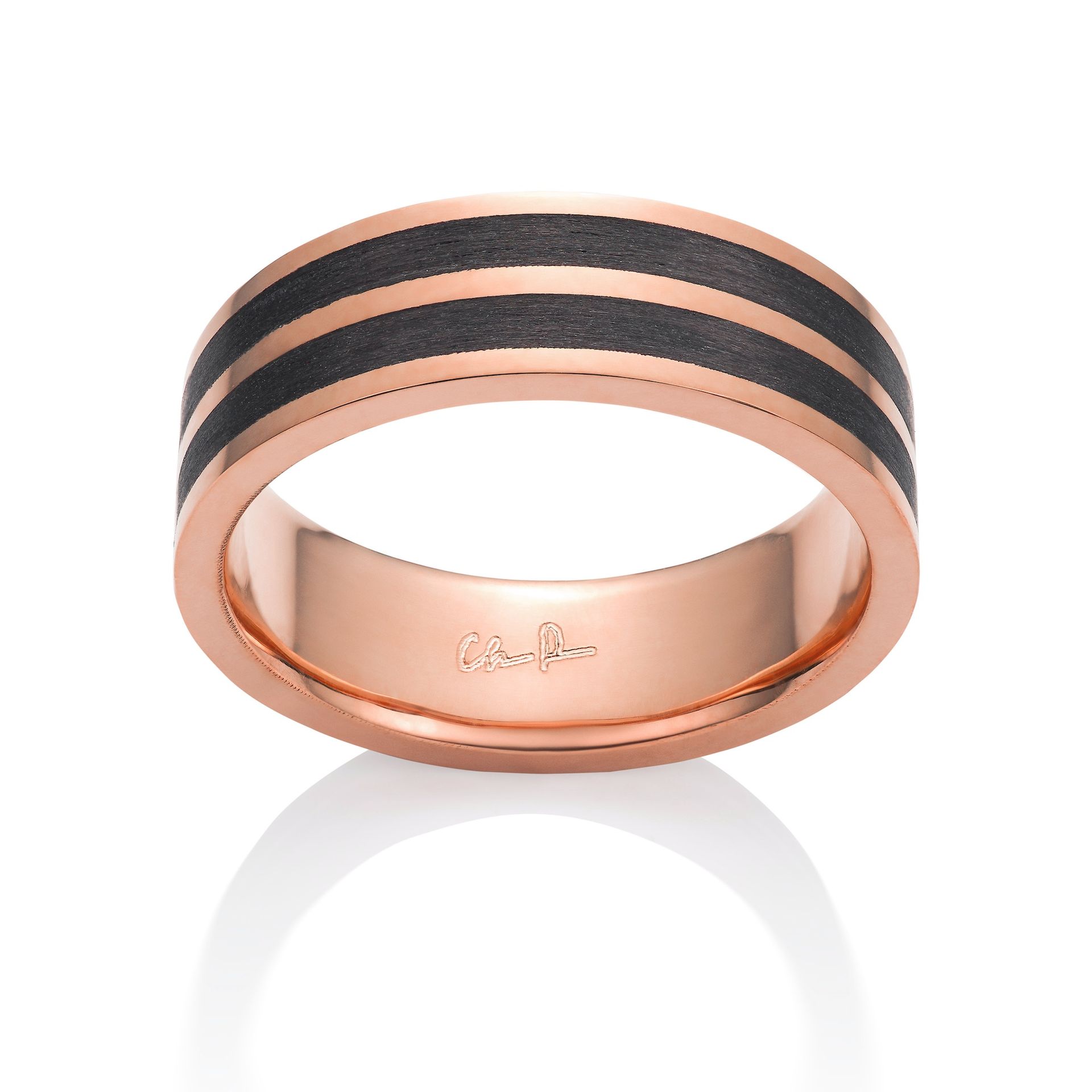 Carbon fiber ring with narrow precious metal channel and centered inlay. Flat profile.