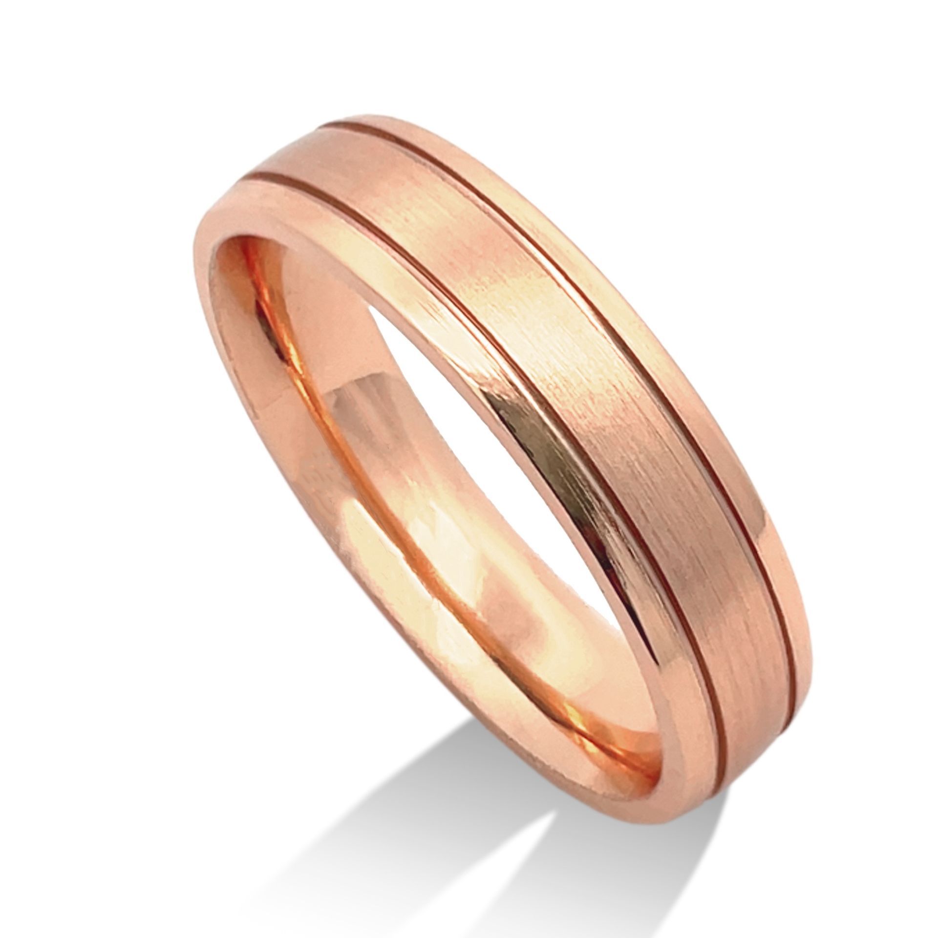 High polish micro-grooves separate medium polished rails from a matte finished center. Slightly rounded profile.